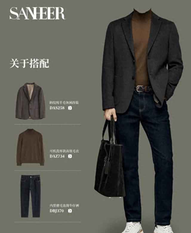三醋酸混纺灰色西裤 + 黑色高领衫 + 牛仔纹理再生聚酯外套(外观像牛仔,实则挺括有型) + 卡地亚太阳能腕表(光照15分钟就能续航一周,出差人士的福音)