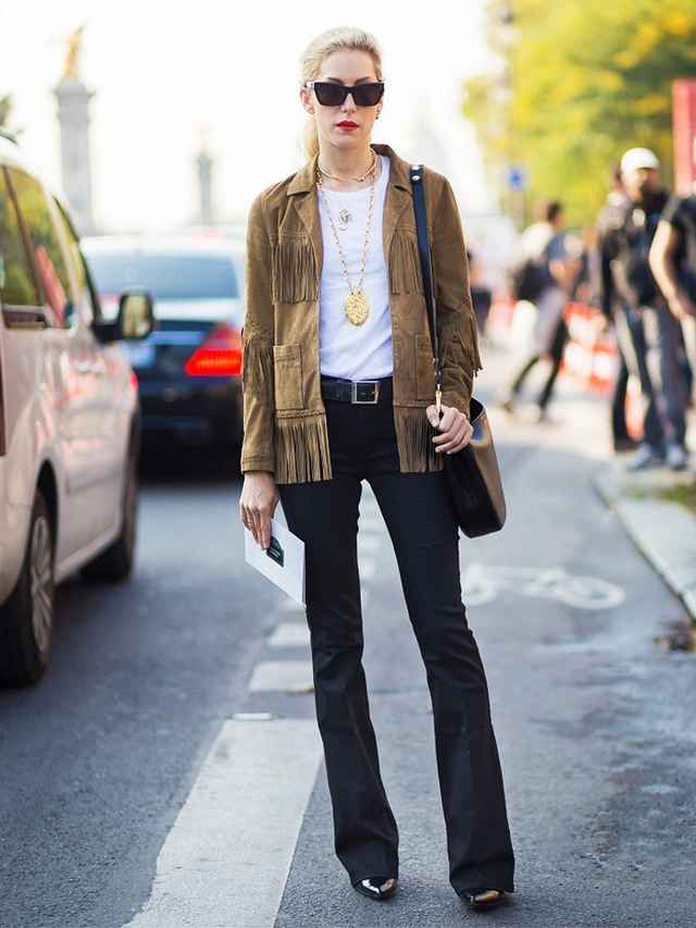上衣别太长:尤其是娇小女生,长上衣配喇叭裤简直是“身高杀手”。最好选择短款,或者把衣角塞进裤腰,明确点出腰线,比例才好-4。
