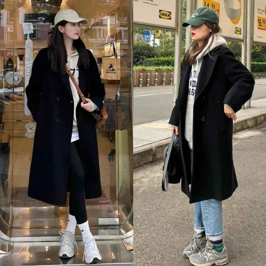 不系扣子、敞开穿是这套搭配的精髓,既能保留大衣的优雅气场,又能摆脱“老气”的标签。这种穿法看似随意,实则充满巧思,敞开的大衣勾勒出流畅线条,弱化腰腹和肩背的不足;内搭卫衣增添休闲感,让整体造型既显成熟女性的端庄,又不失轻松时尚。