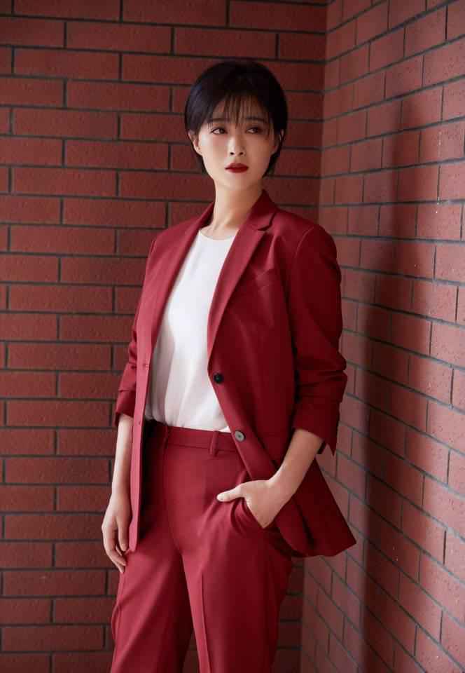 搭配西装时,经典色系最不容易出错,比如黑白配、黑红配或红白配,这三种组合简单又大气。蒋欣用暗红色西装内搭白色T恤,红色显得霸气十足,有种女总裁的强大气场。