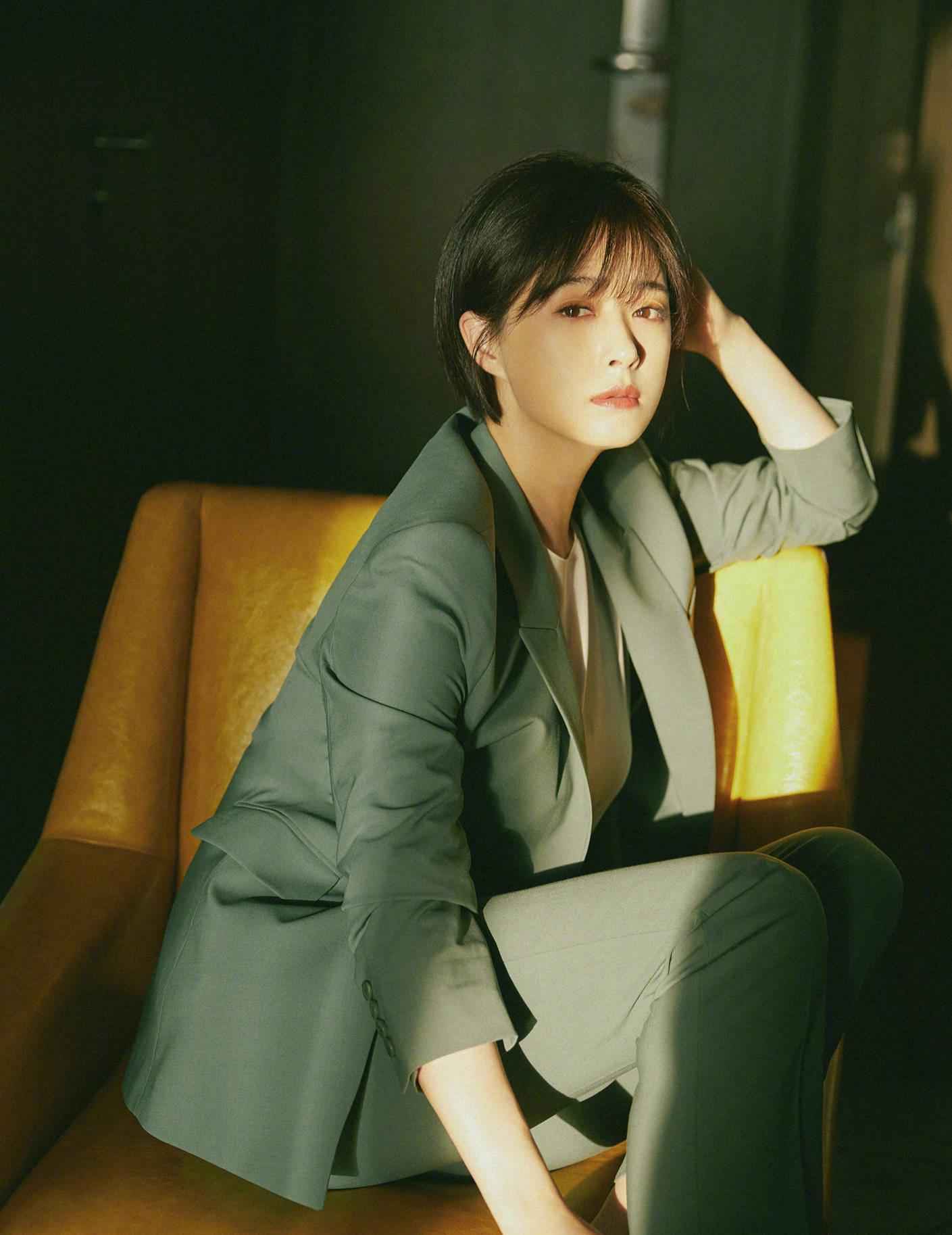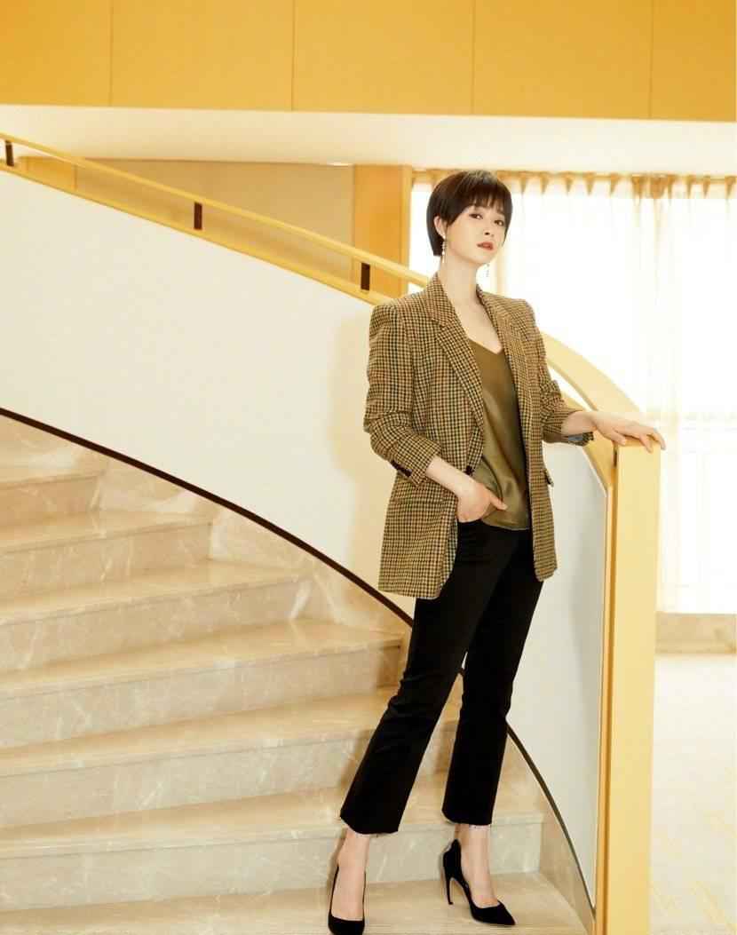 穿一整套浅色西装时,最好选饱和度不高的颜色,避免太亮显黑。蒋欣皮肤白,短发配清新色西装,既有俏皮感,又显干练帅气。