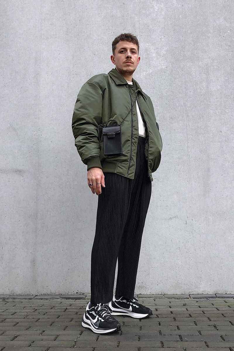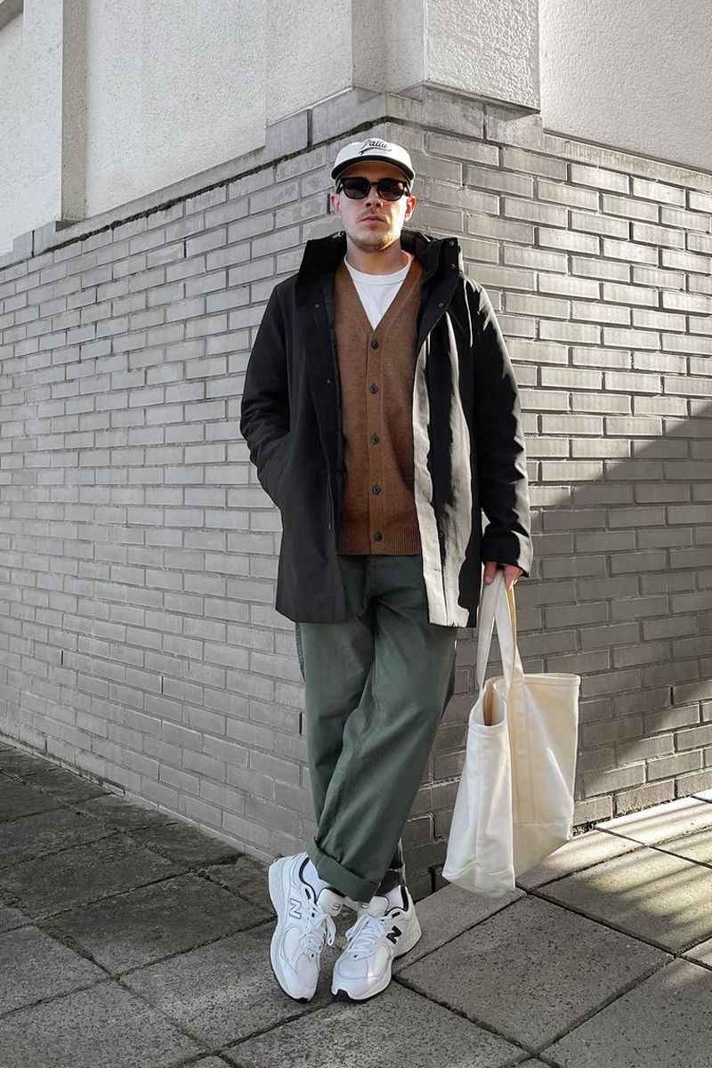 冬季穿搭容易显臃肿,矮个子男士更得注意。九分裤和运动鞋组合,露出纤细脚踝,视觉上轻盈又时髦。