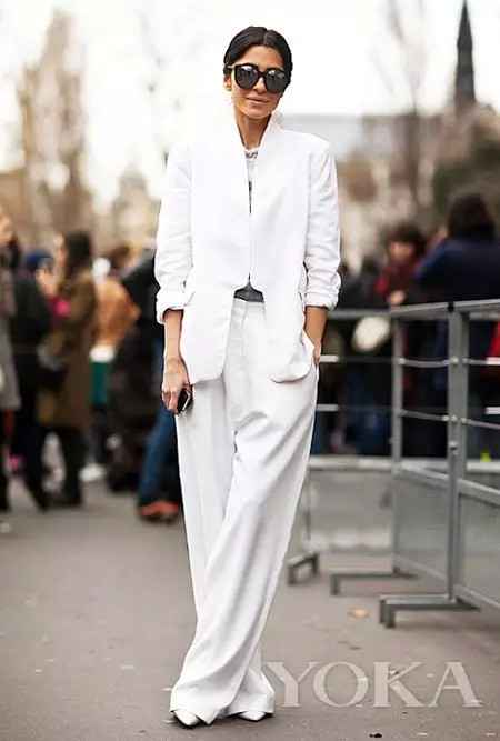 反过来,如果你穿的是一条面料挺括、版型标准的西装裤,那夹克就可以选相对柔软、宽松的款式,比如灯芯绒或者针织面料的白色夹克,营造出一种外松内紧的慵懒时髦感-6。