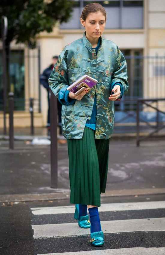 除了牛仔,搭配现代感十足的阔腿裤、利落的西装裤,或是简约的A字裙,也都是不会出错的选择-2-7。这里有个搭配心法叫“上绷下散”或“上繁下简”-7。如果上衣设计感强,有刺绣或花纹,下身就务必保持简洁,用纯色单品来平衡-8。色彩上也不必死死守着大红大绿,试试低饱和度的“新中式老钱风”配色,比如芦灰、辰砂、天水碧这些中国传统色,它们组合在一起,有种不张扬的贵气,显得人特别有内涵-7。
