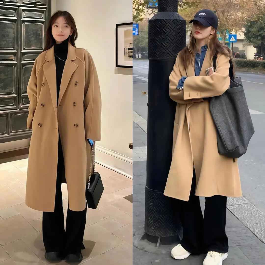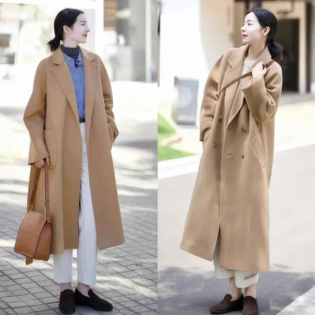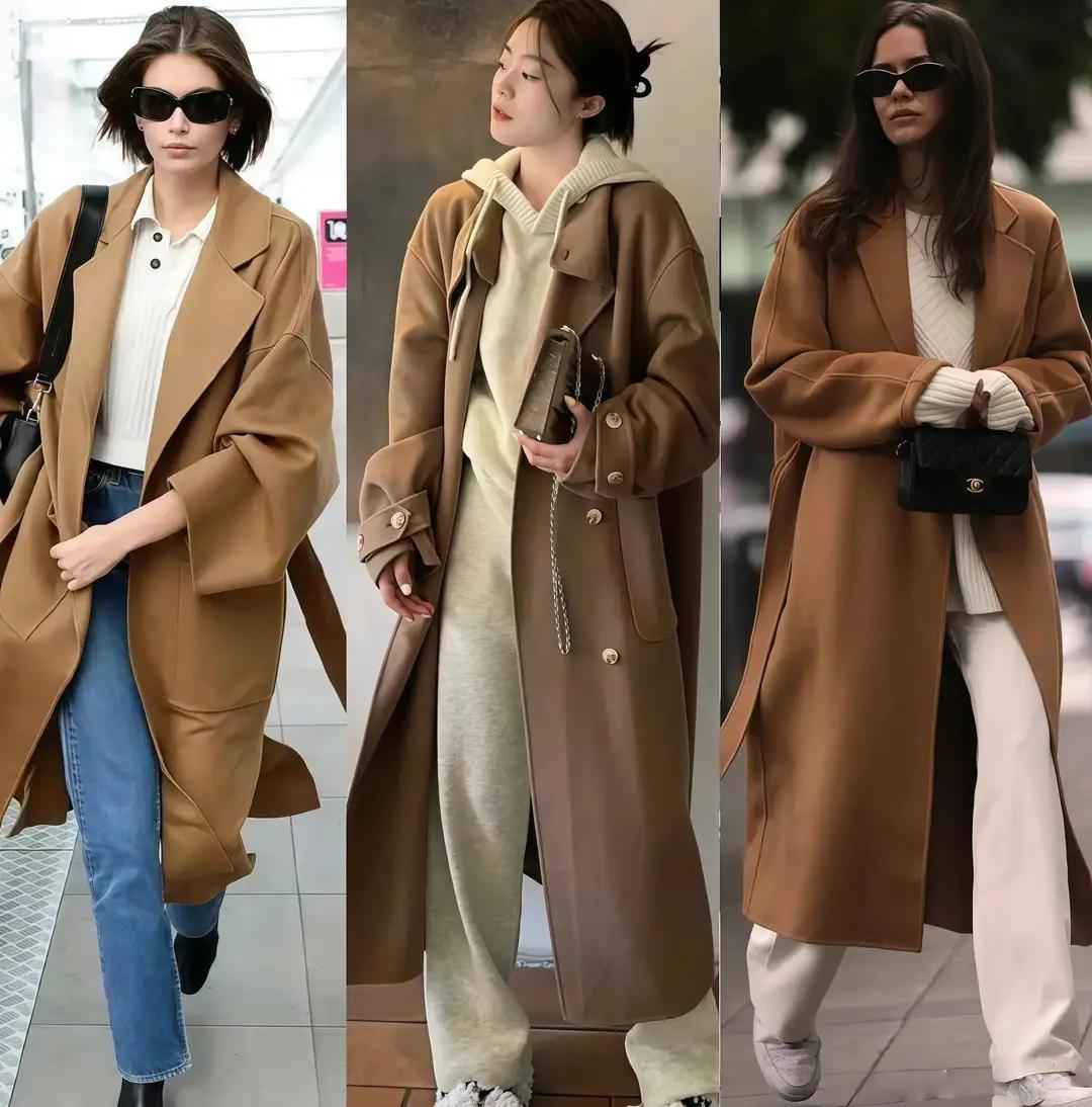 当然,你也可以用驼色大衣内搭卫衣,配灰色或白色休闲阔腿裤,日常出门这么穿,舒服又好看。