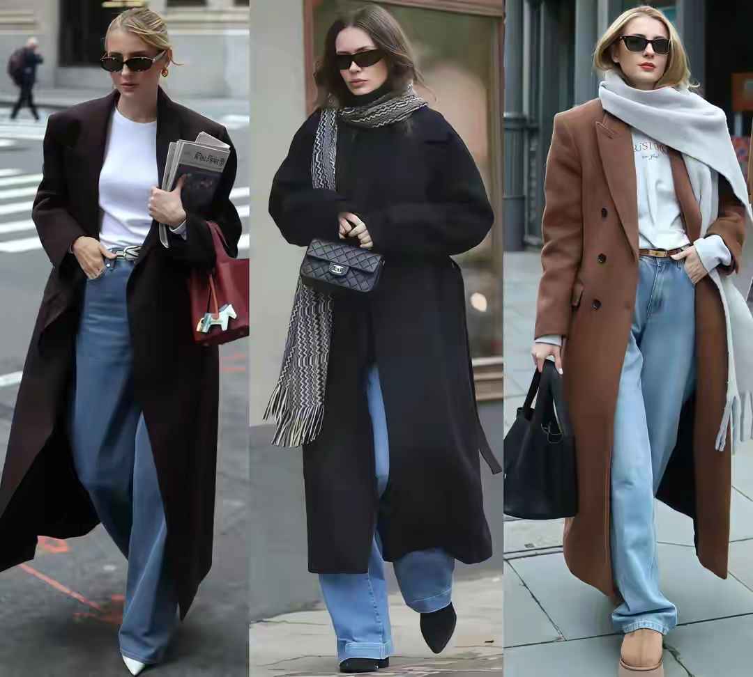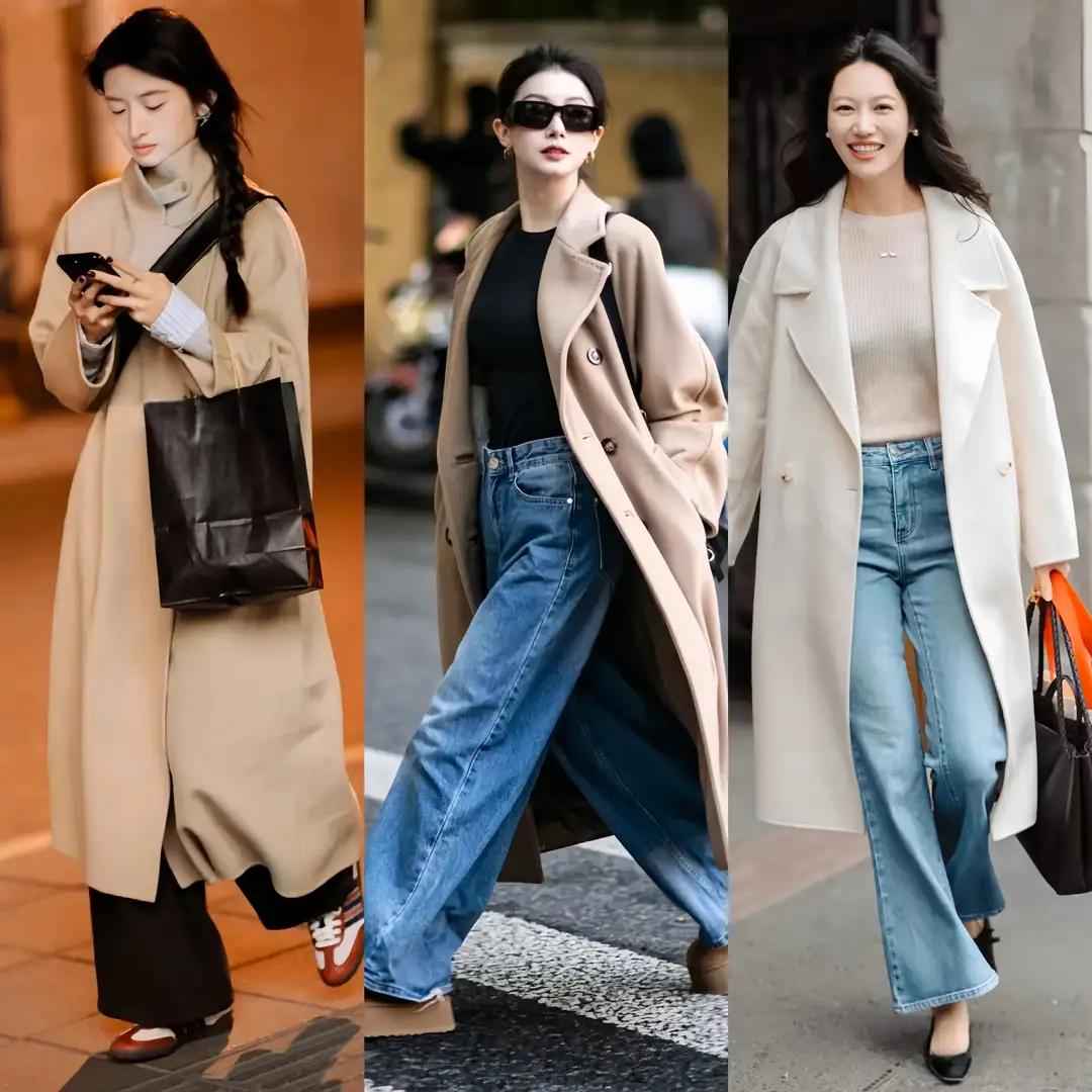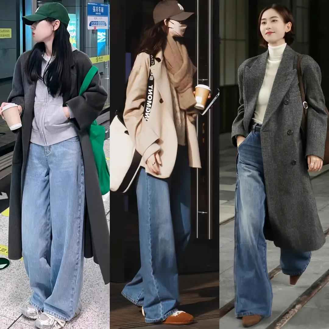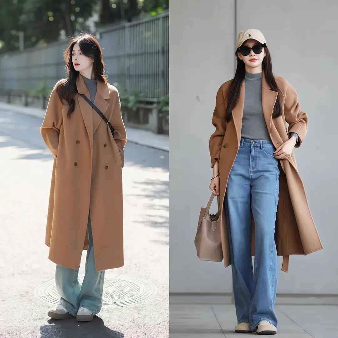 灰色大衣配牛仔阔腿裤也能穿出休闲通勤感,但阔腿裤不能随便选。面料要柔软垂顺,长度到脚踝最好,太长会显得拖沓。