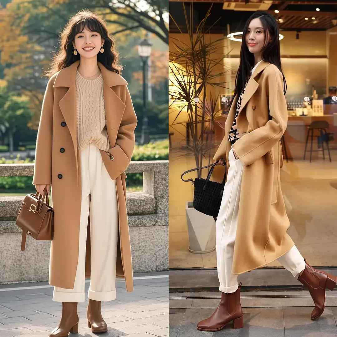 ③:驼色大衣配白色阔腿裤