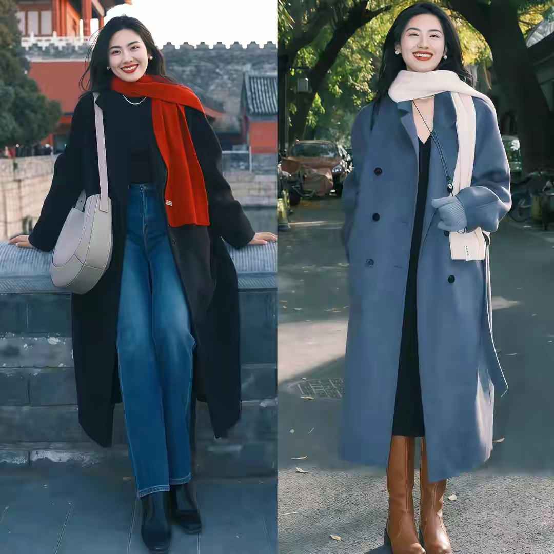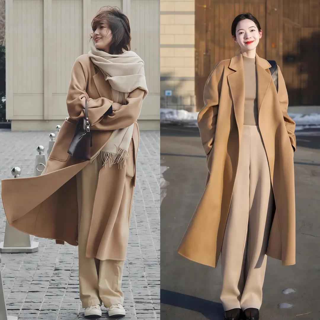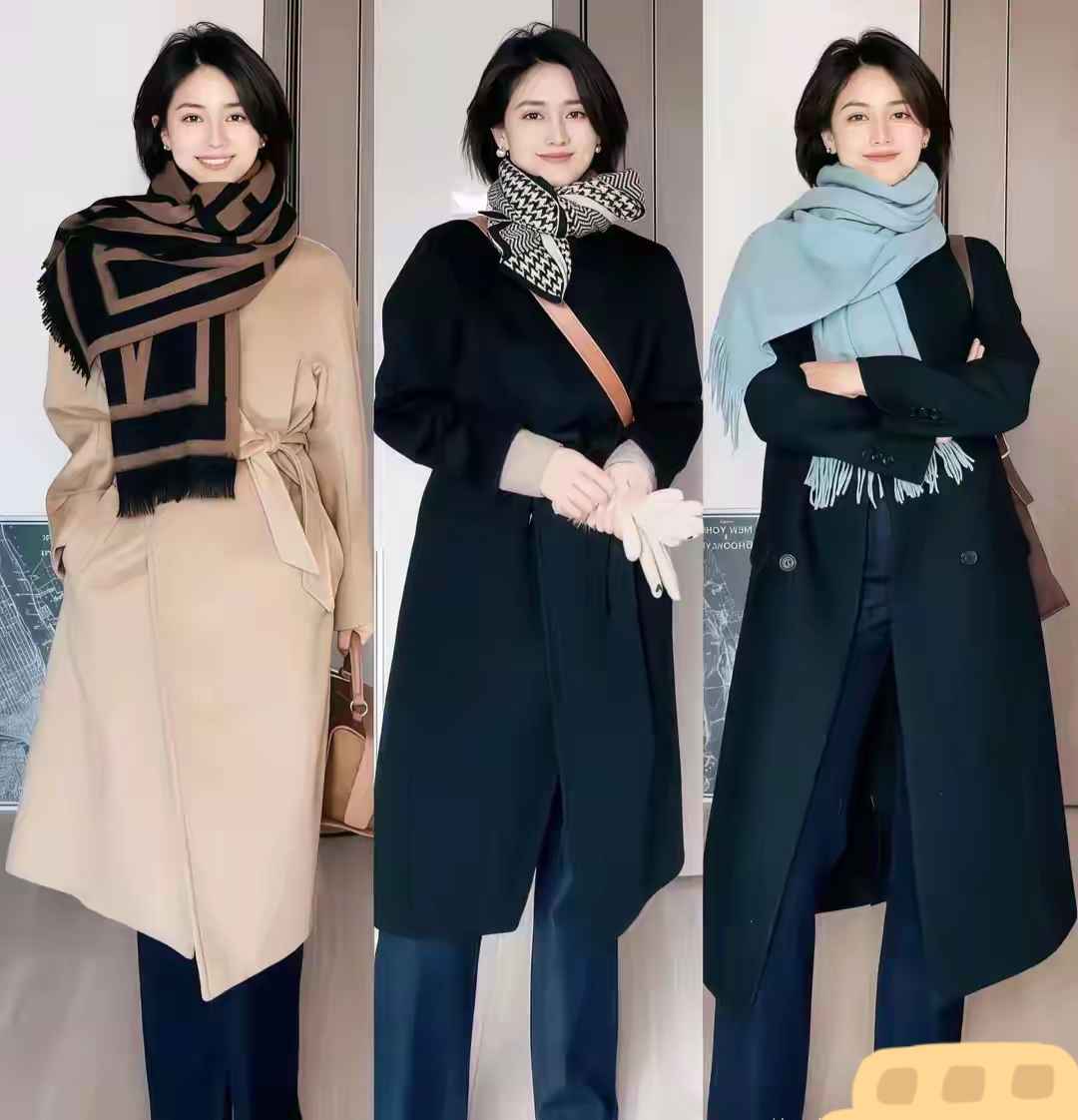 选大衣时要注意腰线,高腰或带腰带的设计更显高。下半身可以配西装裤,再加条围巾,通勤风立马就有了。