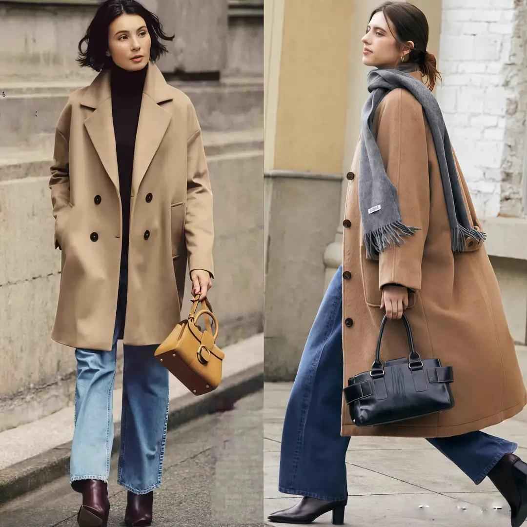 穿驼色大衣时,建议配深驼色或棕色皮质包包,顺色搭配更显精致。